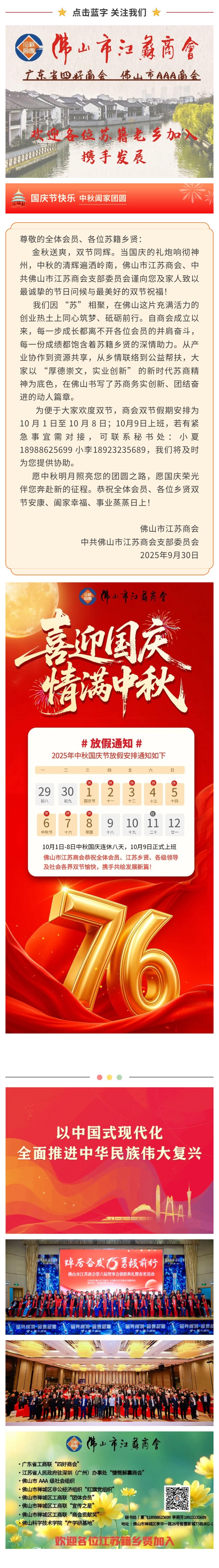 佛山市江苏商会、党支部致全体会员、苏籍乡贤双节贺信及放假安排