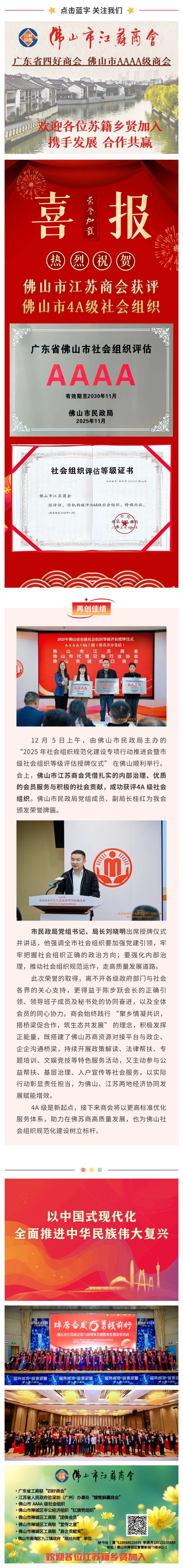 喜报|佛山市江苏商会获评 4A 级社会组织,再添荣誉新章!